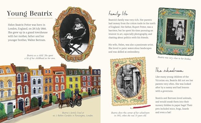 Peter Rabbit fans will enjoy learning how Beatrix became a master storyteller. As was typical for a girl from a wealthy Victorian family, she was looked after by a nanny and had lessons with a governess. She inherited a love of art from her parents, got lost in stories, and practiced drawing characters from the books she read.
