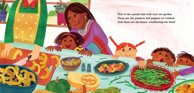 Yum! And there’s more — foods to reflect the diversity of her family, including “toasty tamales” and “samosas, spicy and hot.” This is all topped off with Gran’s homemade bread, Dad’s huckleberry jam, their traditional rice pudding, and lots of P-I-E-S!! 🙂