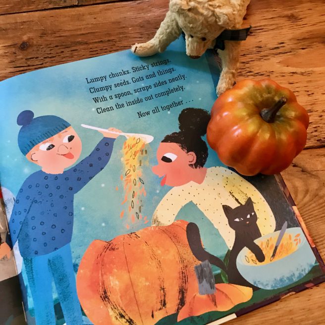 Just as he did with Pick a Pine Tree, where he included a white cat, this time there’s a winsome black cat for keen eyes to track from spread to spread. Not sure if the cat followed the family home from the pumpkin patch, or if he belonged to them in the first place, but he’s adorable as he balances on fences, plays with the blackbirds, peers out the front window, or sticks his little paw into a bowl of pumpkin “guts.”