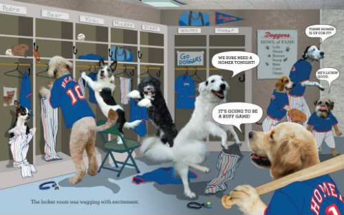 For Homer, Shelley and Diane again combined photographs with digital art to create a series of tickle-your-funny-bone illustrations, and this time they’ve upped the ante with a charming story that pairs dogs with baseball.