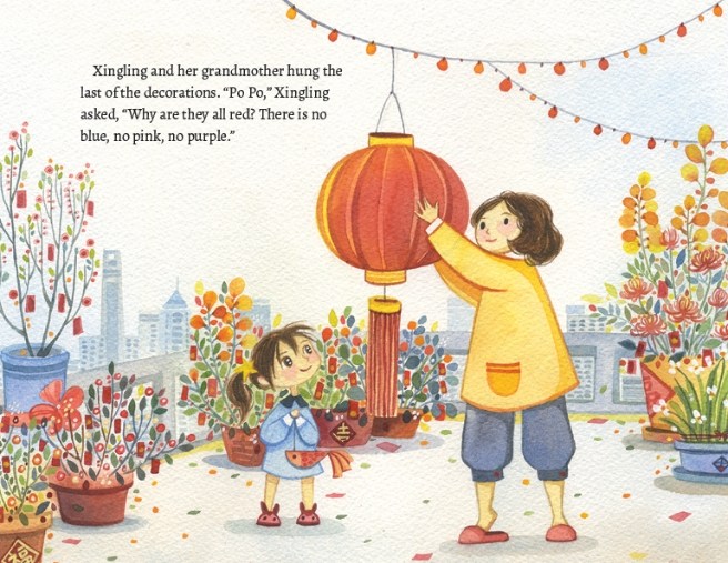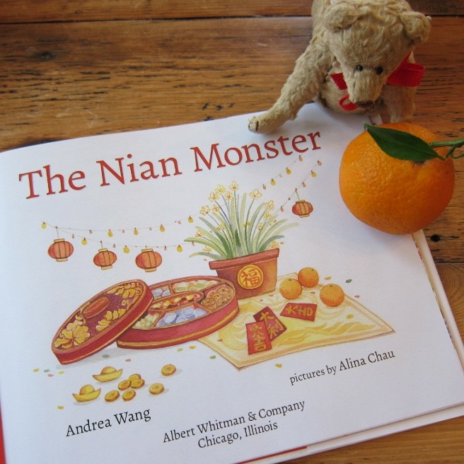 In The Nian Monster by Andrea Wang and Alina Chau (Albert Whitman, 2016), young Xingling wonders why all the Chinese New Year decorations are red, so her grandmother (Po Po) tells her all about the Nian Monster — a ferocious creature with “jaws as wide as caverns” and “teeth sharper than swords,” who would get so hungry every Spring, he left his home in the mountains to consume entire villages.