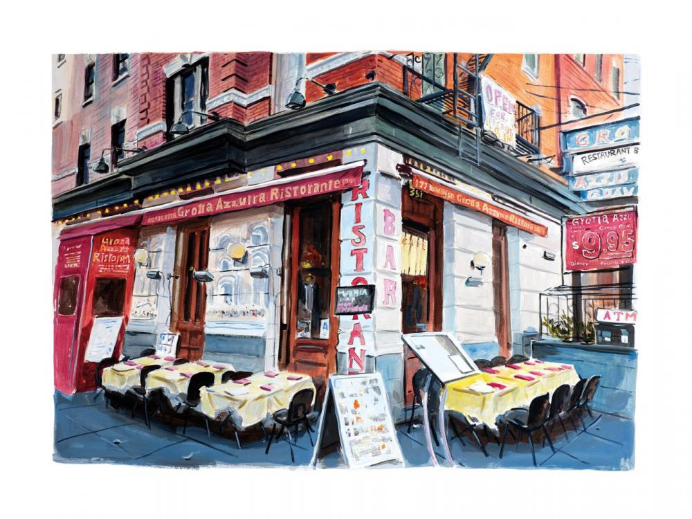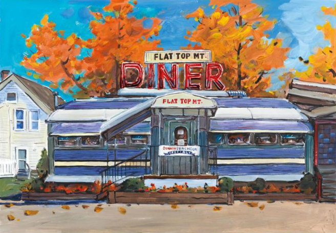 I love his frequent use of blues, and of course how often he depicts eateries. It’s fascinating to see the world through Dylan’s (blue) eyes 🙂 — he’s drawn to back streets, alley ways, country roads, bridges, train tracks — landscapes and urban scenes “unpolluted by the ephemera of pop culture.” There’s a noted absence of people in most of these paintings, conveying a sense of loneliness and a nostalgia for simpler times.