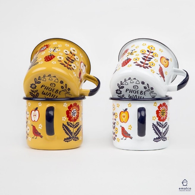 See more of Phoebe’s work at her official website, that contains a link to her online shop which features prints, cards, t-shirts and accessories. She just started taking pre-orders for these new Fruit and Flower enamel mugs yesterday (love!).