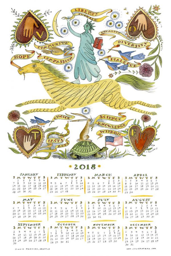 2. Once again, author/illustrator extraordinaire Julie Paschkis has created a cool wall calendar to benefit the ACLU. The 2018 Hope Calendar celebrates the values of the United States: