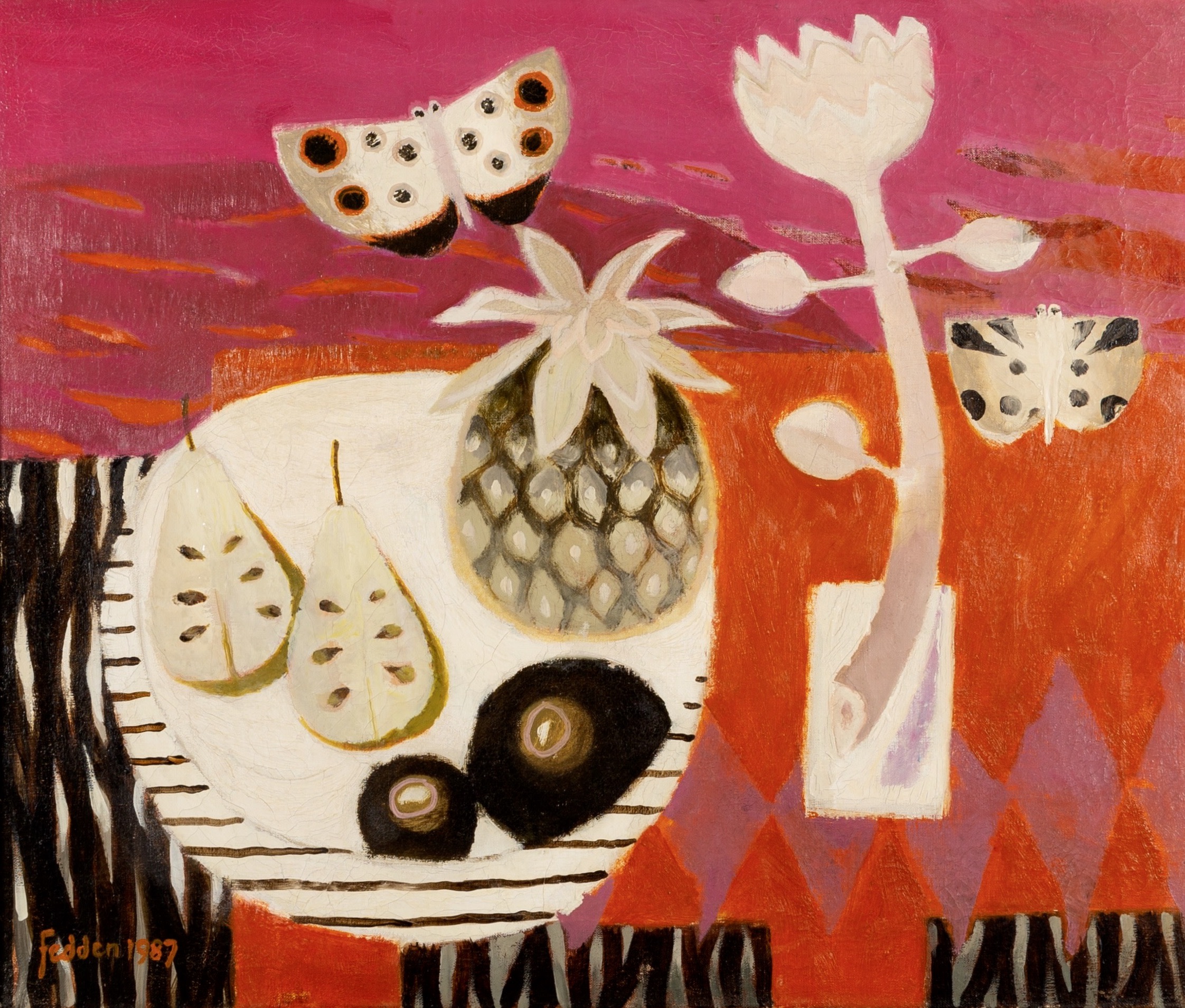 Inspired by walks along the beach, she featured coastal landscapes, cottages, beach huts, boats, and seagulls in her earlier paintings. In recent years, her main focus has been people and humor (“unreal characters in sometimes strange pursuits”).