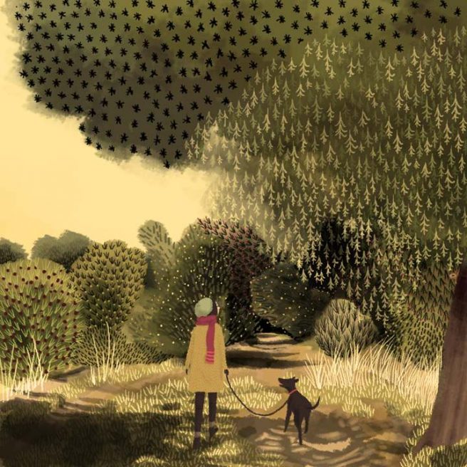 Clearly inspired by the natural world, her work is characterized by gorgeous color combinations and an exquisite attention to detail. She also includes some surprises in her landscapes every now and then — foxes, birds, dogs, people.