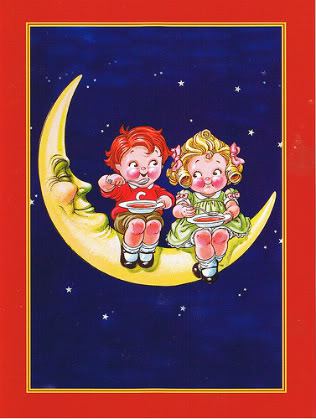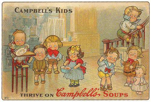 You probably recognize the pudgy, rosy-cheeked pair perched on the moon as the Campbell’s Kids. Created in 1904 by Philadelphia illustrator Grace Wiederseim Drayton, these American icons have never lost their appeal as the most successful soup pushers in advertising history. As a child, I loved them just as much as all the yummy soups that came out of those famous red and white cans.