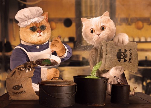Check out these feisty felines: Robert, Earl of Grimalkin; his beautiful Chat-elaine, Korat; their three daughters, Minxy (the pretty one), Serval (the prettier one) and Lady Etcetera (the other one); heir presumptive Matthmew; and of course, the one and only Dowager Catness, Vibrissa. Let’s not forget Catson the Butler, Mrs. Mughes the Housecreeper, Thomas Farel (Evil Foot Cat), Tom the Chau-fur, Laisy (Kitchen Maid) and Mrs. Catmore the Cook.
