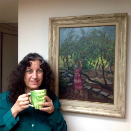 ☕☕ JUST ONE MORE SIP: Short poems related to the [above] photograph of myself drinking café con leche beside my father’s painting of my mother picking pomegranates. She was wearing sandals, but he left them out, and I have chosen to speculate about the reason.