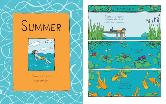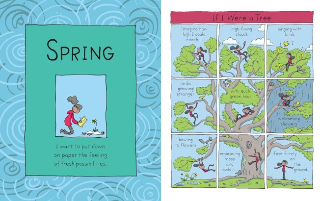 The poems in Poetry Comics (Chronicle Books, 2024) are organized by season, with each section offering insights into the poetry writing process. Title pages inspire and direct: