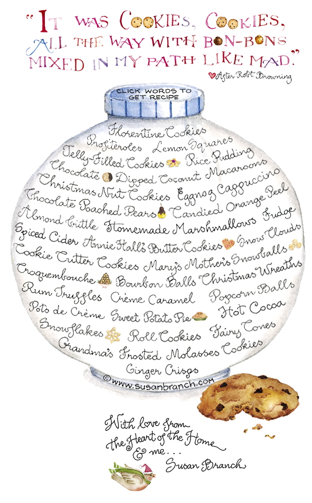 I’ve been a longtime Susan Branch fan, and have a pile of her books and calendars to prove it. Her drawings and watercolors are every bit as gorgeous as her handwritten quotes, musings and commentaries, and her illustrated recipes are the best, so lovingly infused with her special brand of cozy charm.