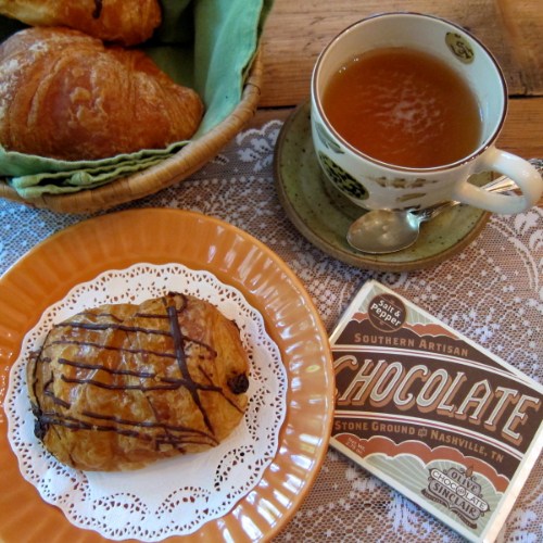 Please help yourself to tea and croissants. The pain au chocolat is especially good — is there a better way to greet the day than with buttery, flaky pastry wrapped around a decadent piece of deep dark chocolate? *rapture*