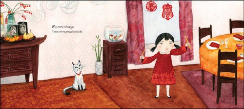 Hungry young readers will easily identify with Maggie’s struggle to master a new skill, enjoy meeting her colorful family, and cheer her victory. And yes, like me, they’ll likely drool at how Isabelle Malenfant, with her warm palette of vibrant reds and oranges, has set the family table with tantalizing Chinese food (cha siu bao! ha gau!), and love the winsome cat who licks its chops while waiting patiently for a piece of shrimp.