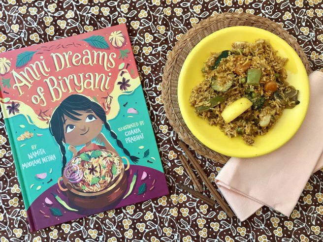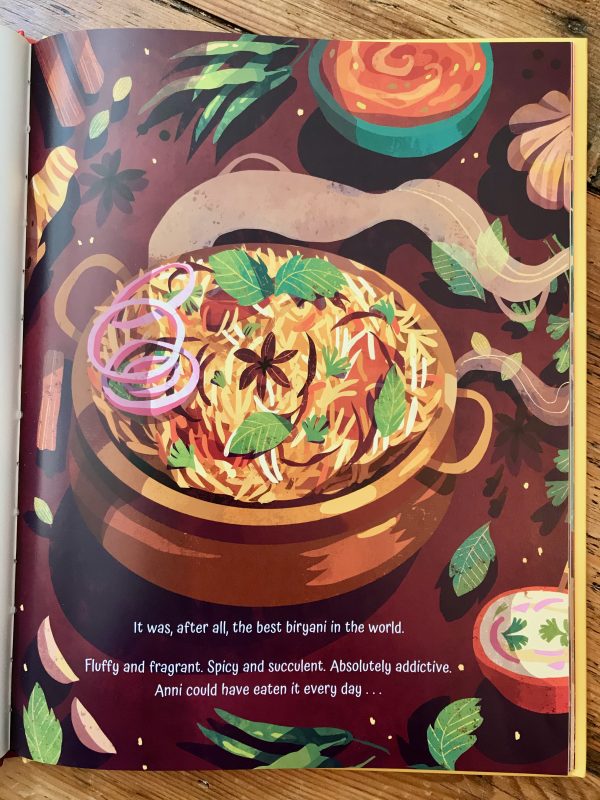They next explore “long aisles of noodles, sauces, spices, pickles and tea,” making sure to add medicinal herbs for Grandma and “numbingly hot peppers for Dad” to their cart. At the seafood section, the girl notes “the fish seem to stare,” right before she rounds the corner to the candy aisle — were she grabs everything (but Mom says can only have one bag)!