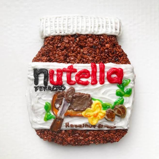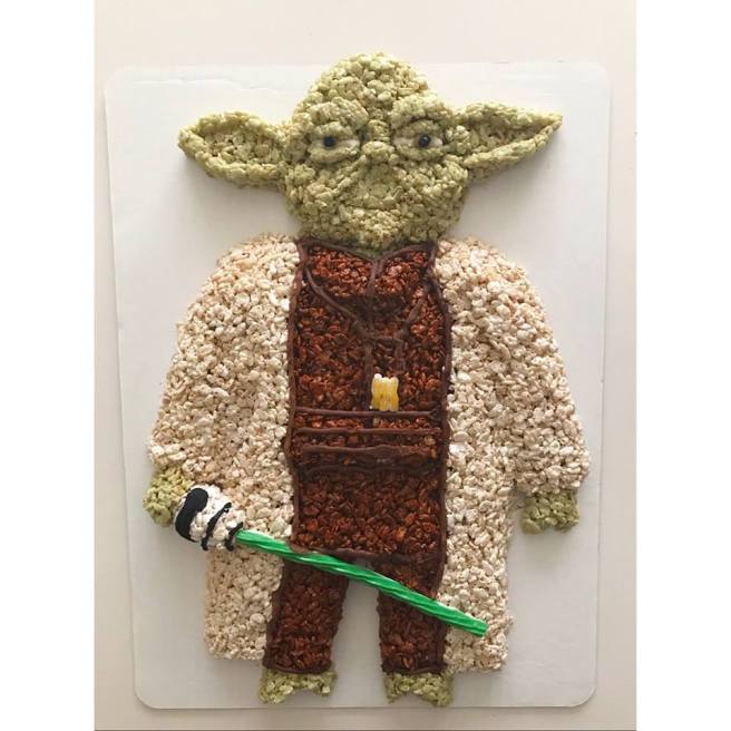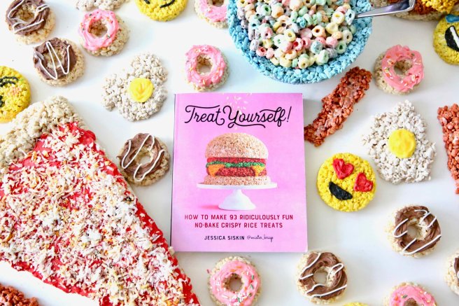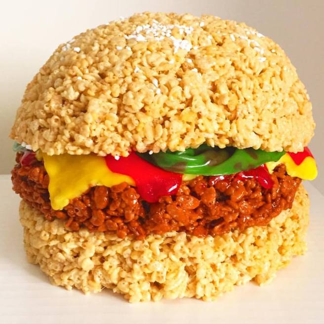 Several years ago, she was asked to bring a dish to a potluck birthday party. The only thing she knew how to “cook” was giant heart-shaped Rice Krispie treats. Discovering she could add food coloring to the treats recipe, she was inspired to make a giant cheeseburger. Of course everyone loved it, so Jessica continued to experiment — creating portraits of cartoon characters, famous people (including Kim Kardashian’s rear end), animals, designer bags, and different foods all made with Rice Krispies.