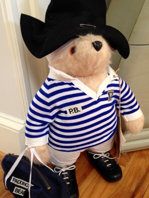 Biggest surprise was a knock knock knock at the front door, where I discovered this charming 20″ Rugby Paddington, made by Gabrielle Designs in England back in 1985. He was a tad tired after his long journey from California via Denver, New Jersey, and Pennsylvania, but quickly revived with marmalade toast and tea. He still won’t tell me what’s in his duffel bag.