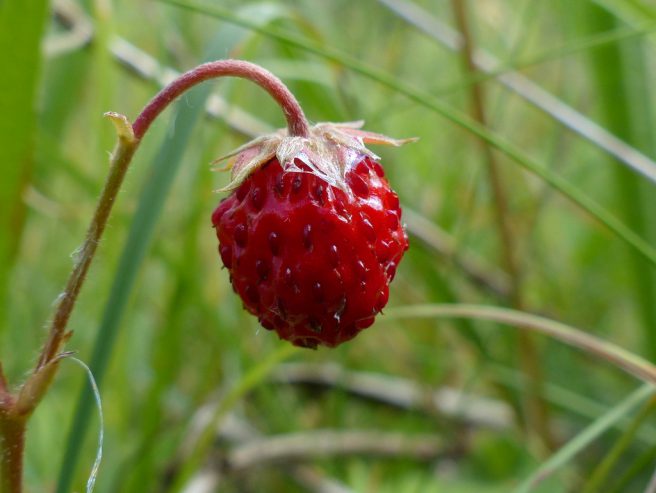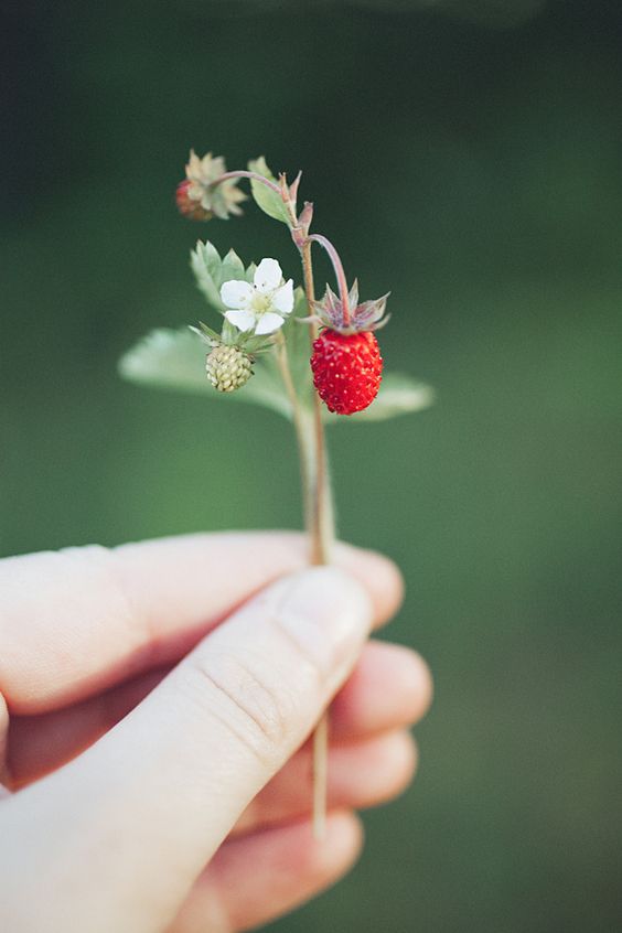 she notices a wild strawberry growing from a crevice.