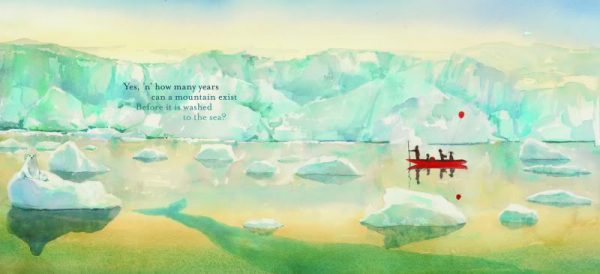 Muth’s idyllic landscapes, characterized by a soothing, inherent stillness, reflect the song’s entreaty for peace, harmony and freedom. The sheer majesty of these natural scenes are in keeping with the spiritual feeling Dylan intended. Each child has his own plane, must travel his own path, find his own answers. By the end of the book, the children and the woman are all playing together with a big red ball. Nearby, there’s an old cannon draped with the flags of several nations, a single red balloon tied to it.