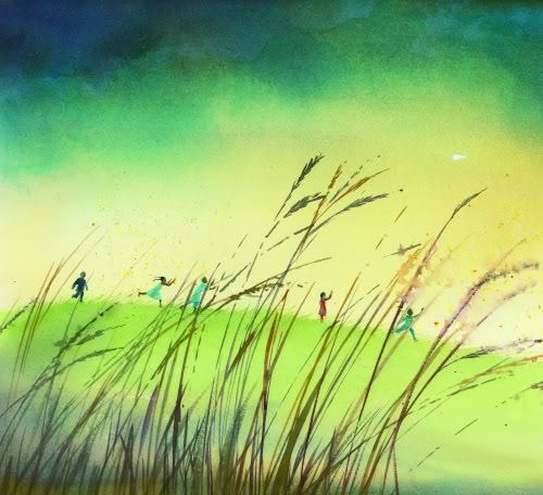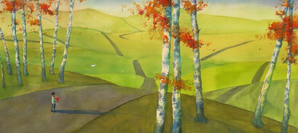 Muth’s paper planes travel through lush, dreamy watercolor landscapes, each scene reflecting a different lyric. Four children and a woman, depicted singly or in groups, appear in the narrative — a journey traversing green fields, hillsides, forests and an ocean. The paper airplane is always present — a silent lodestar which takes on spiritual connotations (“How many seas must the white dove sail/Before she sleeps in the sand?”). I am reminded that the Native Americans view birds as messengers between heaven and earth. The ethereal, capricious wind, invisible but for the flittering of a paper plane, can gently usher in change or cause mass destruction.