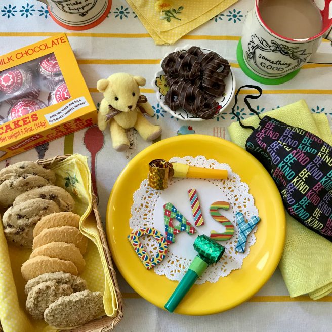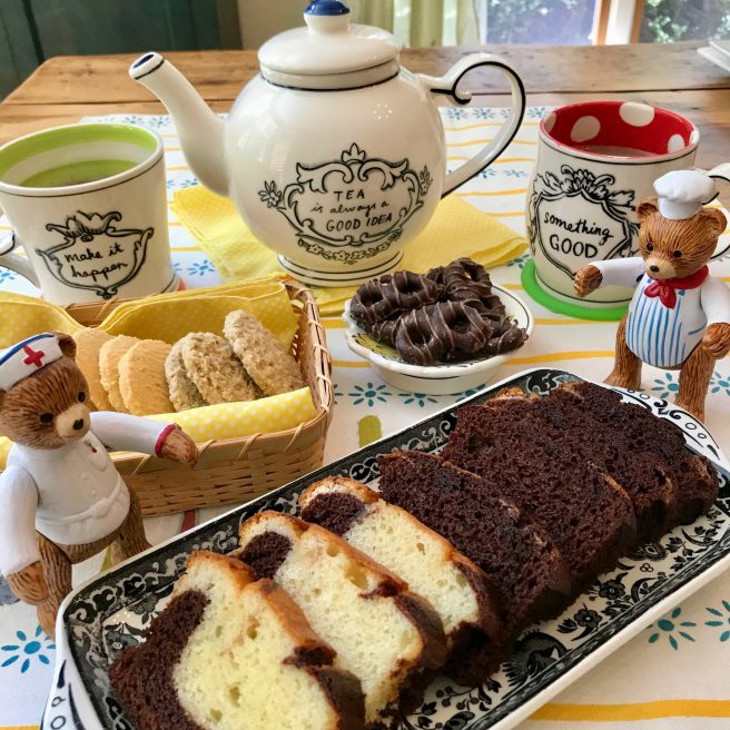 Oh, look — it’s 2:15! In honor of Daisy’s birthday on Wednesday, we’ve set up a little afternoon tea. Please help yourself to some marble cake, dark chocolate pretzels, lemon, oat, and chocolate chip cookies, and of course, a warm cup of Orange Pekoe.