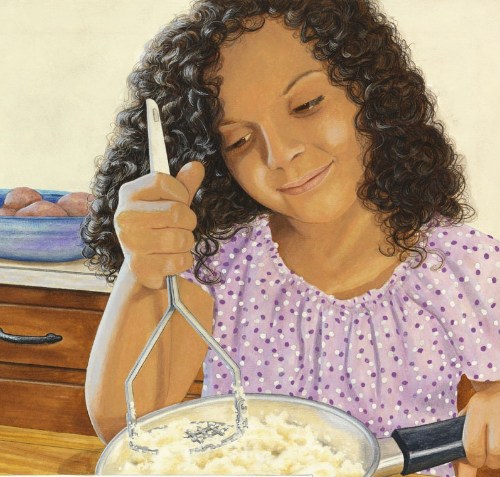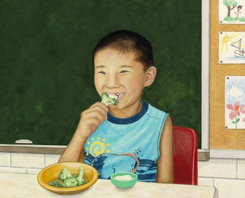 While nibbling on these whimsical poems, curious munchkins will meet basil (“a bouquet of minty green butterfly wings”), delight in how ears of corn listen to the sun, and consider that okra is really “a mountain of mouse-sized swords/stored in fuzzy sheaths.” Afterwards, they’ll likely be anxious to see, smell, touch and taste the produce in person, making up little scenarios so they can write their own poems.