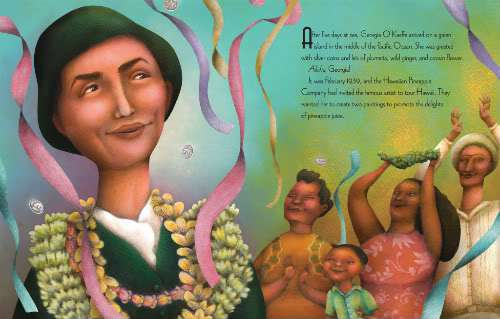 The book opens with Georgia at her easel, painting “flowers so lush and large they filled the canvas.” This microscopic perspective enabled the viewer to appreciate a flower’s minute details. She hoped to make people in the city slow down and take the time to really see the beauty that she saw.