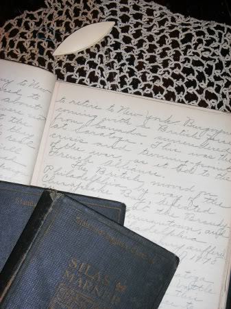 Sadie Rush MacCulloch’s tatting, tatting shuttle and notebook.
