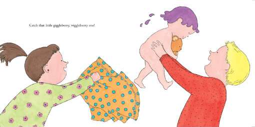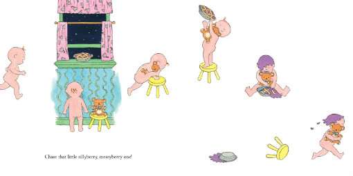The parents first pop the wee one into the tub, where he’s given a nice scrub and rub-a-dub-dub, which sets him to laughing amongst the toys and bubbles. But watch that little tyke — when his mom tries to towel him off, he makes a run for it, and has a messy encounter with a freshly baked pie cooling on the windowsill. That “little giggleberry, wiggleberry one” is finally caught, and it’s back into the tub for another scrub. Then he’s powdered from head to toe — “sugar” on his belly button, nose, fingertips and toes, and finally tucked into his warm “piecrust” (pillows and quilts) with a kiss goodnight. So sweet!