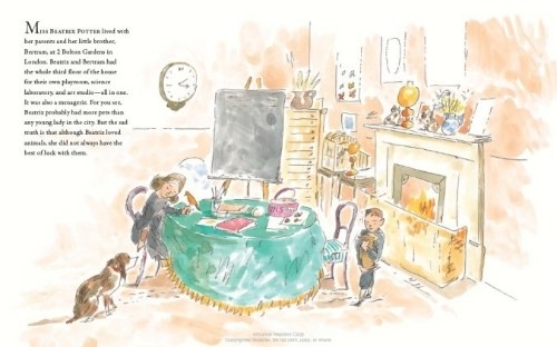 This charming cautionary tale is about the time young Beatrix, who loved to draw and paint wild as well as tame animals, borrowed a guinea pig from her neighbor to use as a live model. She and her younger brother Bertram had lots of pets in the third floor playroom/science lab/art studio of their London home — pets such as snakes, snails, bats, ducks, rabbits, hedgehogs and salamanders. Though Beatrix loved all these creatures, we are warned early on that “she did not always have the best of luck with them.”
