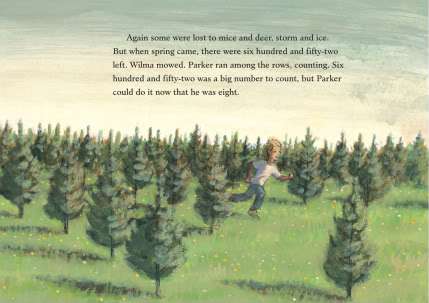When they first measure out the seedling rows, Parker is at one end of the field, Wilma at the other. But a long string connects them, and for the rest of the story, they are shown working towards a common purpose — trimming, cutting, and dragging their trees. This focus on human activity, set against a natural backdrop, will encourage young readers to keep turning the pages.