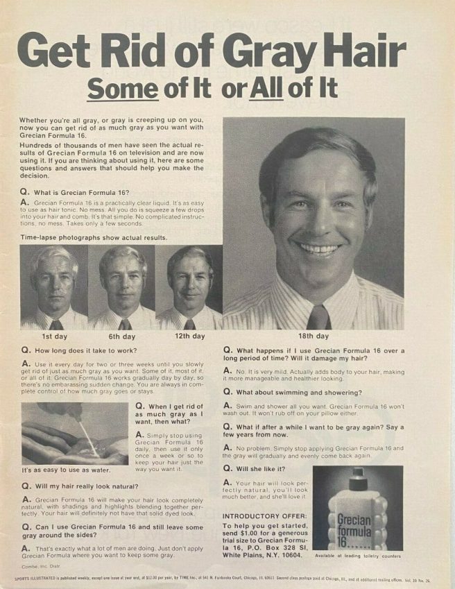 Because I'm getting pretty gray at the temples, which negatively impacts my earning potential and does not necessarily attract vibrant young women with their perfumed bosoms to dally with me on the green hillside, I go out and buy some Grecian Hair Formula.