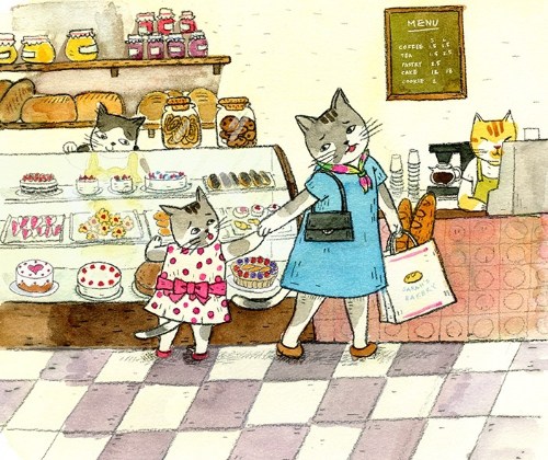 It could have been the cats, the bakery, spicy kimchi, or a mutual love of dumplings, but out of the blue Aram emailed me a couple of weeks ago, after following a 7-Imp link to my review of Miracle on 133rd Street. She was happy to discover Alphabet Soup and told me she’s currently working on a food-related picture book called Kimchi Pancakes. Yum! Her debut picture book, Cat on the Bus (Holiday House, 2016), will be out this Fall. Generous Aram also created a special “Cat Bakery” blog header for Alphabet Soup (feast your eyes ⬆⬆⬆). Totally purrrfect, of course! Is there anything better than connecting with kindred spirits? Just goes to show the power of FOOD! Be sure to visit Aram’s website to see more of her charming work!