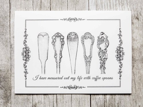 8. Let us go then, you and I, when the evening is spread out against the sky . . . As a panacea for those restless nights in cheap hotels and saw-dust restaurants with oyster shells, treat yourself to a set of J. Alfred Prufrock Coffee and Tea notecards from CS Literary Jewelry. Just curious: have you measured out your life with coffee spoons?