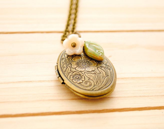 The quote appears on one side, and a brass heart stamping appears on the other. There’s an ivory Czech glass bellflower and olive green leaf on the front of the locket. Pretty, no? More details here.