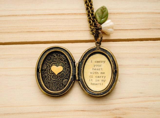 9. Finally, another Poetry Month treat: check out this E. E. Cummings Quote Locket from Busy Beez and Chickadeez. “i carry your heart with me(i carry it in my heart)” is one of my fave Cummings poems, and what better way to keep this beautiful line close than in a personal locket?