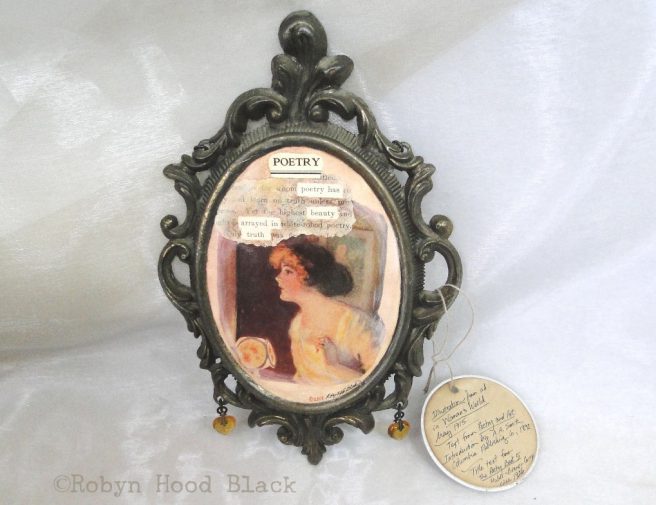 I also love this OOAK Found Poem mixed media/collage piece. The image is from the May 2015 issue of Woman’s World, and features a lovely lady from a 1915 talcum powder advertisement. Two vintage topaz-colored glass hearts dangle from the bottom of the fancy vintage dark bronze color metal frame made in Italy. There’s a chain attached to the back for easy hanging.