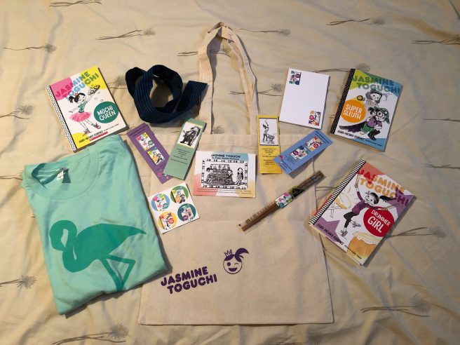 Includes silk-screened bag created by illustrator Elizabet Vukovic, 2 author-signed Jasmine paperbacks (Books 1+2), 1 author-signed hardcover of Drummer Girl, Jasmine flamingo t-shirt and more!