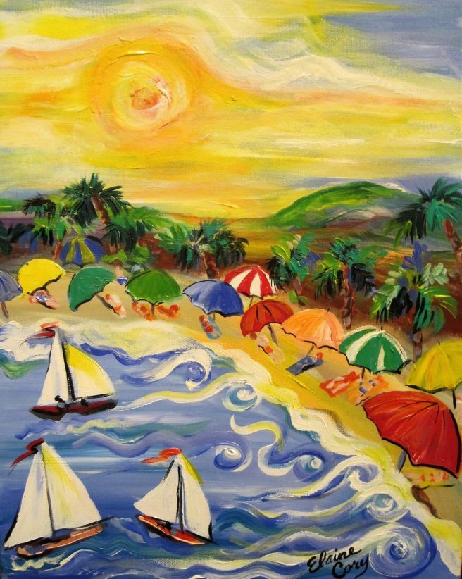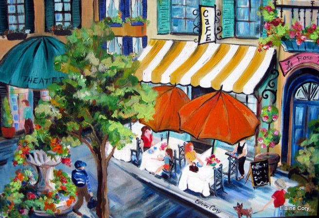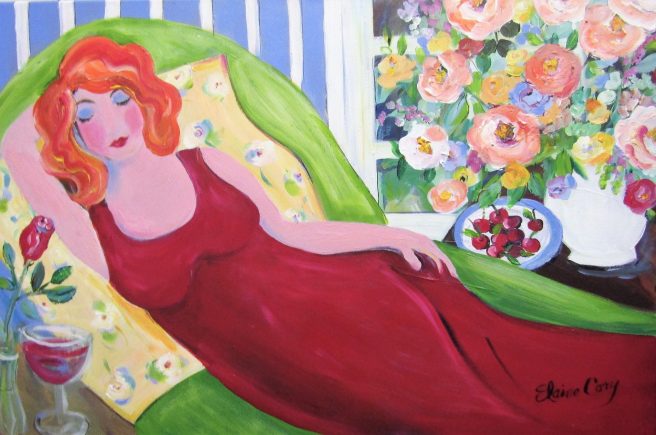 1.Hello April (come she will)! I see you there on your chaise lounge, totally relaxing with a glass of wine and a bowl of cherries. Who said April is the cruelest month? Doesn’t look that way to Nevada based artist Elaine Cory, whose vibrant, textured paintings transport us to a dream world.