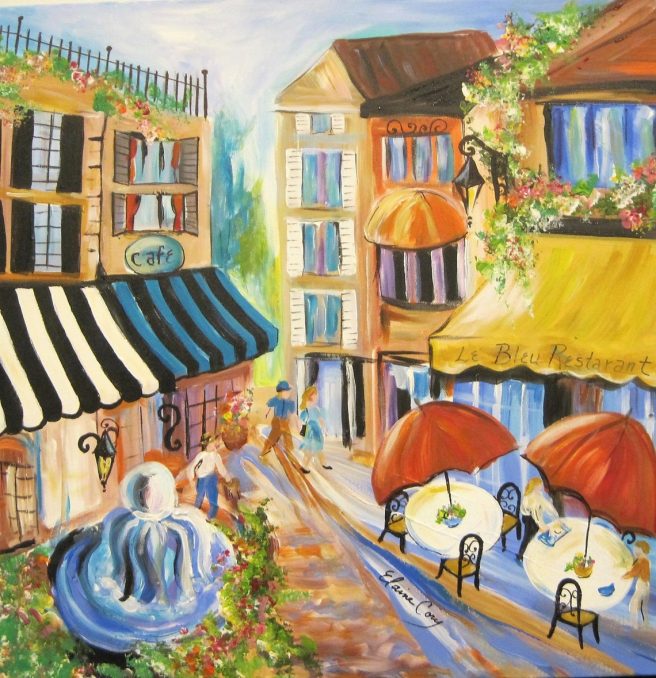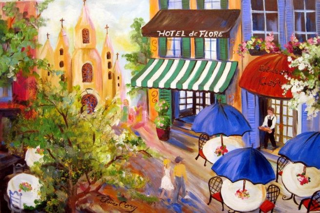 She’s known for her color saturated florals, gorgeous landscapes, and pretty street scenes that make you wish you could be relaxing on a balmy tropical isle or sitting at an outdoor Parisian café right this very minute. Mais, oui!