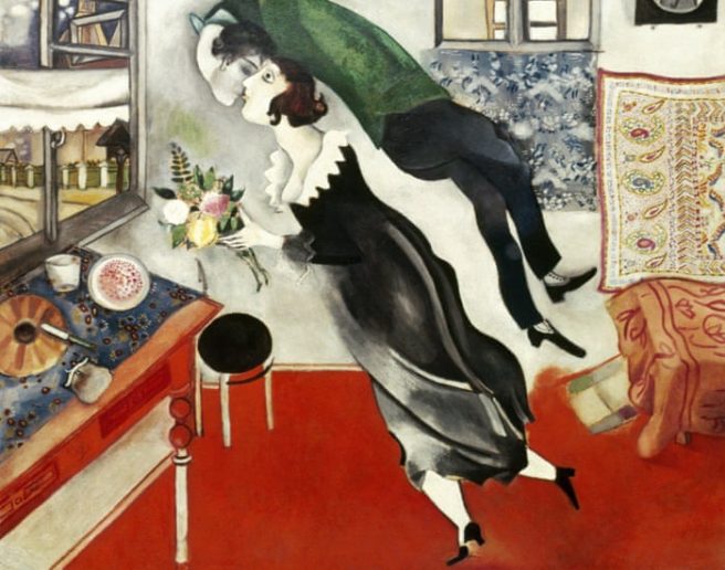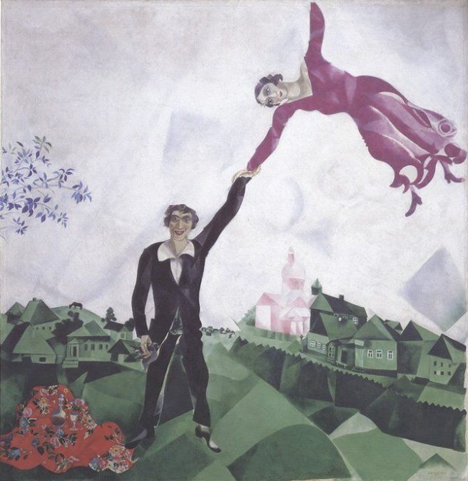 Upon reading this poem, I thought immediately of Marc Chagall. After all, he’s considered “the ultimate painter of love.” He masterfully captured the euphoria of love with his levitating lovers, who blissfully float on air, defying gravity, soaring beyond earthly realms as one.