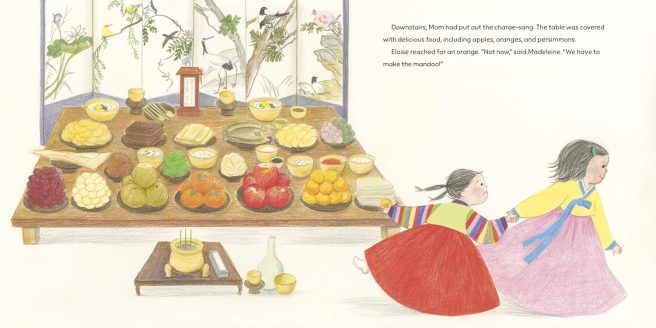 Next, they race downstairs, where they see that their mom has already laid the charae-sang (ceremonial table) with delicious foods such as apples, oranges and persimmons as an offering to their ancestors. Before Eloise can grab an orange, Madeleine pulls her into the kitchen to help wrap dumplings.