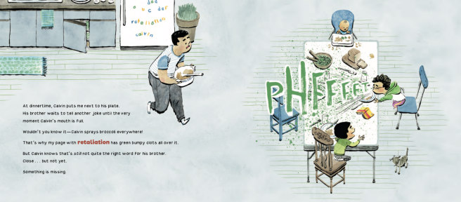 As I thought about Calvin, it came to me that if he was always looking for the right word, his dictionary would certainly become tattered and worn out. Then—it hit me. Calvin’s poor, beleaguered dictionary would be the narrator, and so that’s how he became to be exactly that. He helps Calvin out with all sorts of words, but it’s Calvin himself who discovers just the right word for his brother—and his dictionary is overjoyed. I hope young readers will be surprised and tickled, too.