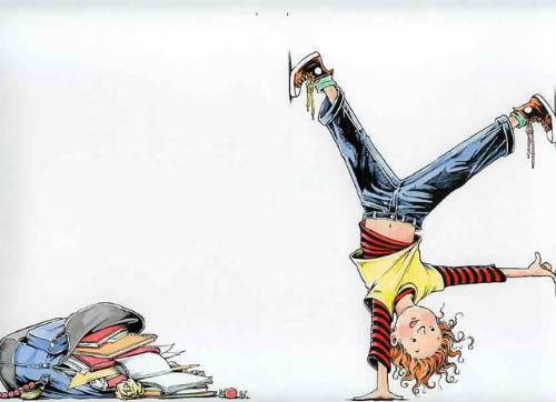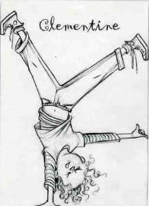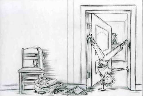 In one exploratory sketch, I drew her doing a handstand in Principal Rice’s doorway.