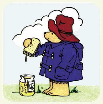 First, there’s an adorable mini book about Paddington’s favorite food, called My Book of Marmalade (HarperCollins, 2008). Marmalade is what sustained our bear on his long voyage from Darkest Peru to Paddington Station in London. He made the jar Aunt Lucy gave him last the entire trip, thanks to a skill he learned as a cub: eking. This is the fine art of making a chunk last for several days (easiest for those without functioning teeth). As you may know, Paddington is never without a marmalade sandwich tucked under his hat for emergencies. Some of these have been known to remain there for weeks.
