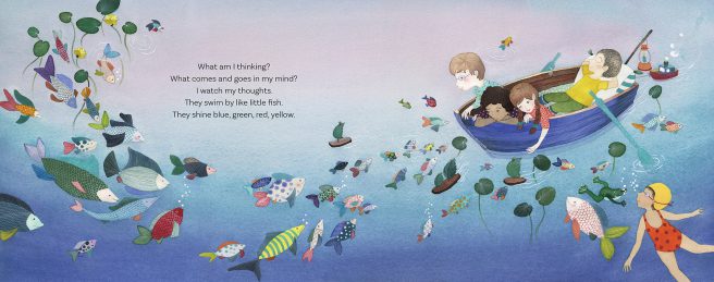I like all of the spreads, but I’m particularly fond of the little fish, just their colors and the way they swirl across the pages, with the children looking a bit like fish themselves.