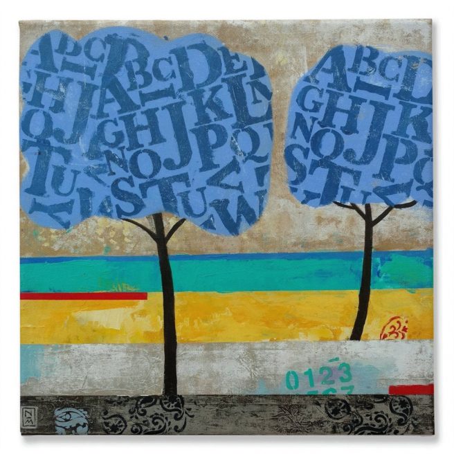 As a typography freak, I swooned when I noticed text and numbers in some of his work. Letters floating around in paintings always make me happy, but alphabets in two blue trees? Have mercy!
