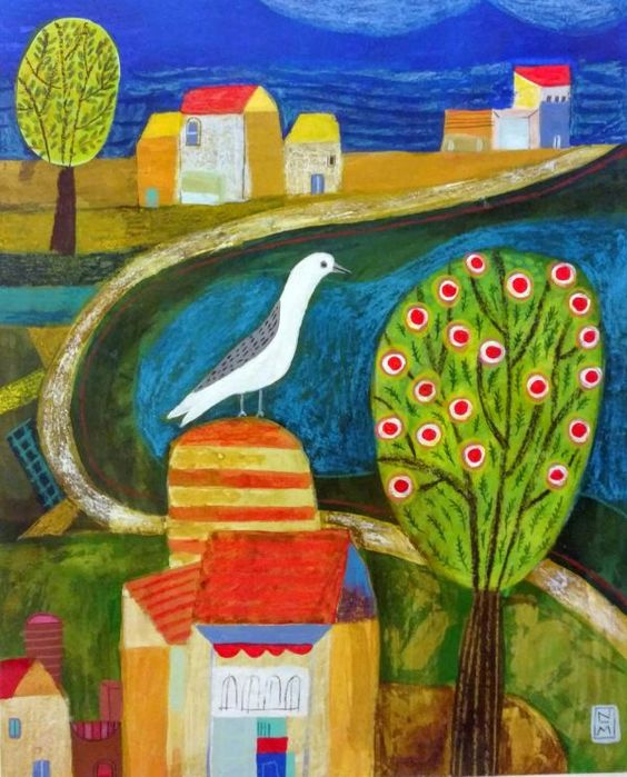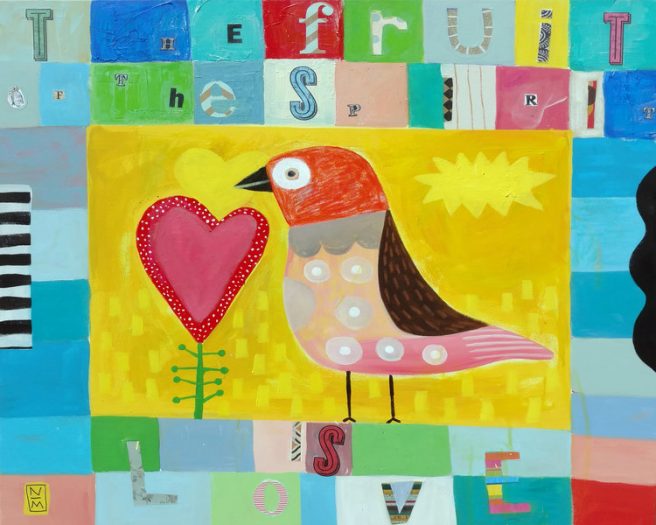 I enjoy the playful spirit and child-like quality of his narrative pieces. Colors, textures, and simple renderings of flowers and animals evoke 19th century primitive folk art, but still feel contemporary.