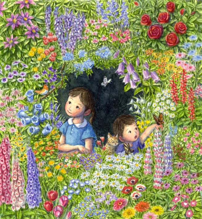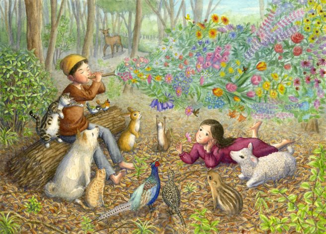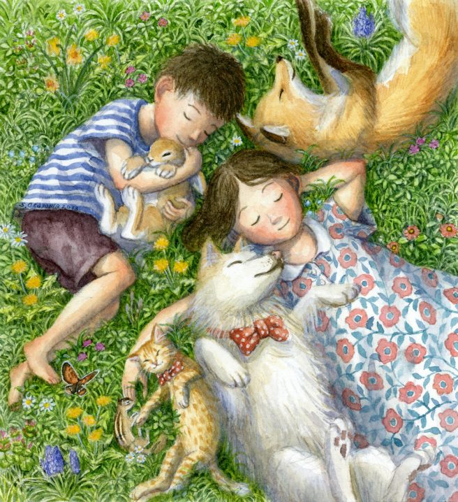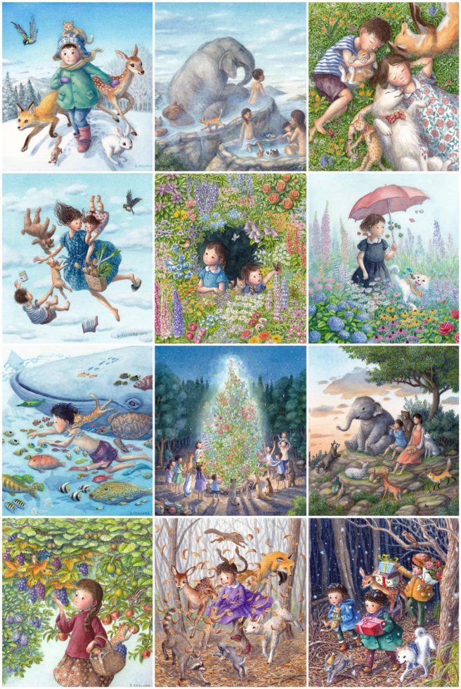 I stumbled upon his work on Pinterest and was immediately taken with his beautiful colors, extraordinary level of detail, and gentle depictions of children and animals, who are portrayed on equal footing and living in total harmony.