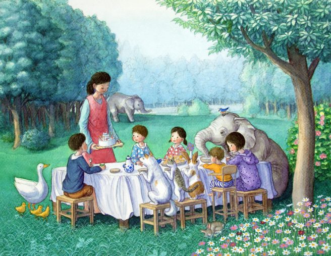 He paints an idyllic world, where children are free to explore their surroundings and enjoy wonderful adventures with many wild creatures on land and from the sea. He injects elements of the surreal in some of his pictures, as boundaries between earth and ocean disappear.