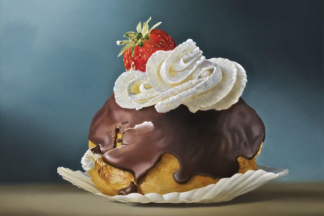 Those of you who nosh here regularly know I have a penchant for photorealistic paintings. Especially of food. It’s a good calorie-free, guilt-free way to indulge (my eyes are always happy to do the chewing). 🙂